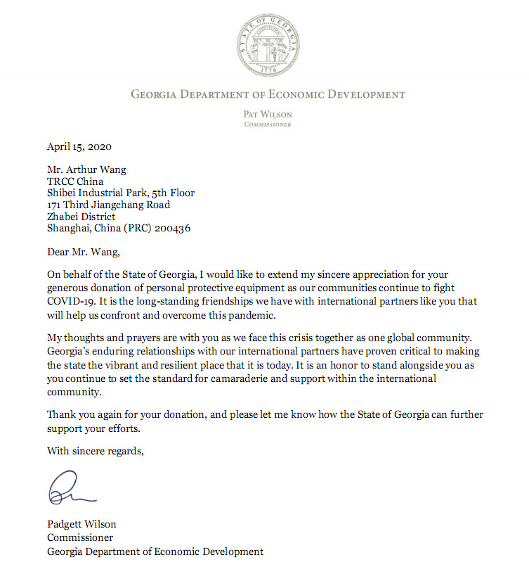The post 美國(guó)佐治亞州經(jīng)濟(jì)發(fā)展署署長(zhǎng)致謝王閩先生的個(gè)人防護(hù)裝備捐贈(zèng) appeared first on 綈亞希西紡織橡膠(連云港)有限公司.